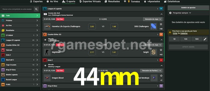 O 44mm oferece uma grande seleção de opções de apostas em e-sports com probabilidades competitivas